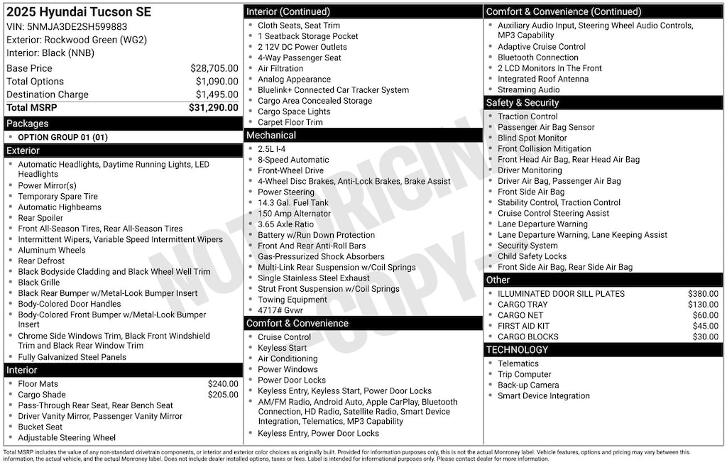 Experience the 2025 Hyundai Tucson SE, a masterpiece in the world of sport utility vehicles. This Tucson, dressed in the sophisticated Rockwood Green, is designed for those who crave both style and substance. Under the hood, its 4-cylinder engine, paired with an 8-speed automatic transmission with Shiftronic, promises a smooth and responsive drive, perfect for urban adventures and highway cruising alike. The Tucson SE's forward-thinking design is complemented by advanced safety features, ensuring peace of mind on every journey. With its spacious interior, the Tucson offers ample room for both passengers and cargo, making it an ideal companion for weekend getaways or daily commutes. The intuitive infotainment system keeps you connected, while the sleek exterior lines and bold grille make a statement wherever you go. Embrace the future of driving with a vehicle that offers not just transportation, but an experience. The 2025 Hyundai Tucson SE is more than just a car; it's your new favorite place to be.